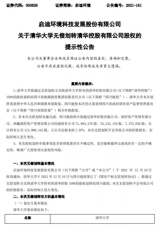 城發(fā)環(huán)境吸并啟迪環(huán)境一事,又有新消息。 不過(guò),這一次不是兩家公司自己的動(dòng)作,而是啟迪環(huán)境的母公司有了新變動(dòng)。 12月11日,啟迪環(huán)境發(fā)布公告稱,四川省能源投資集團(tuán)有限責(zé)任公司(下稱“四川能投”)與清華大學(xué)于12月10日簽署《國(guó)有產(chǎn)權(quán)無(wú)償劃轉(zhuǎn)協(xié)議》,以無(wú)償劃轉(zhuǎn)方式接收清華大學(xué)持有的清華控股100%股權(quán)...