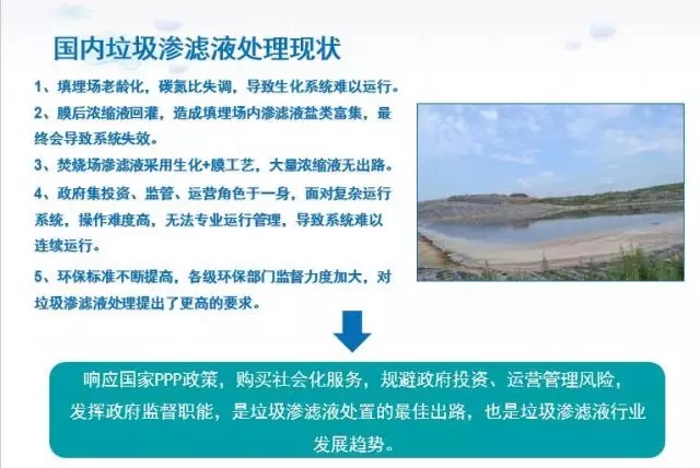 在2017年5月中國(guó)環(huán)聯(lián)第一屆固廢技術(shù)論壇上,大連廣泰源環(huán)保科技有限公司對(duì)我國(guó)滲濾液處理現(xiàn)狀進(jìn)行了總結(jié),并對(duì)垃圾滲濾液的處置提出了響應(yīng)國(guó)家PPP政策,購(gòu)買社會(huì)化服務(wù),規(guī)避政府投資、運(yùn)營(yíng)管理風(fēng)險(xiǎn),發(fā)揮政府監(jiān)督職能,是垃圾滲濾液處置的行業(yè)發(fā)展趨勢(shì)。