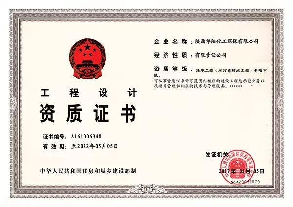 2017年5月5日,陜西華陸化工環(huán)保有限公司獲環(huán)境工程(水污染防治工程)專項設計甲級資質證書。住房和城鄉(xiāng)建設部對照現(xiàn)行工程設計資質標準,經過仔細篩選、反復核查申報材料,最終審核授予華陸環(huán)保環(huán)境工程(水污染防治工程)專項設計甲級資質。本次從乙級資質升級為甲級資質,是對華陸環(huán)保整體設計水平和綜合實力的全面考核。