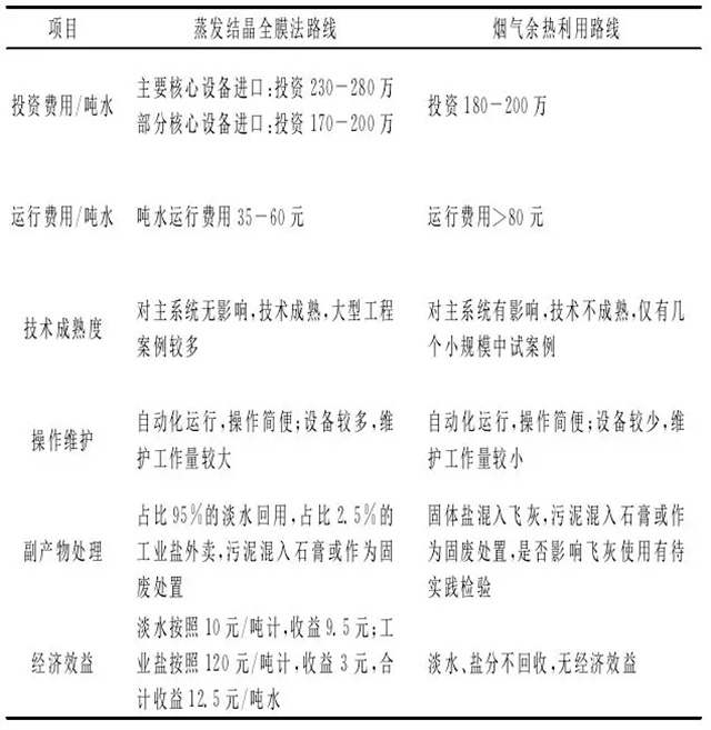 蒸發(fā)結(jié)晶全膜法工藝路線與煙氣余熱利用工藝路線比選。煙氣余熱利用廢水零排放是近來比較熱的技術(shù),經(jīng)常拿來跟蒸發(fā)結(jié)晶式零排放工藝相提并論,但它不能實現(xiàn)水資源和鹽資源的回收和再利用。2種工藝路線比較結(jié)果,見表2。