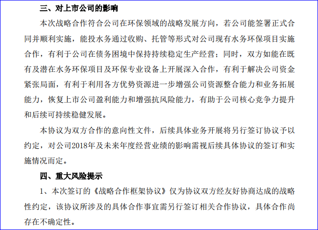 同時(shí),雙方如能在既有及潛在水務(wù)環(huán)保項(xiàng)目及環(huán)保專業(yè)設(shè)備上開(kāi)展深入合作,有利于解決公司資金緊張局面,有利于利用各方優(yōu)勢(shì)資源進(jìn)一步增強(qiáng)公司資源整合能力和業(yè)務(wù)拓展能力,恢復(fù)上市公司盈利能力和增強(qiáng)抗風(fēng)險(xiǎn)能力,有助于公司核心競(jìng)爭(zhēng)力提升和后續(xù)可持續(xù)穩(wěn)健發(fā)展。
