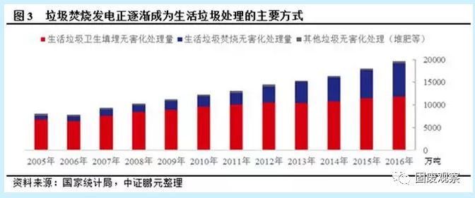 垃圾焚燒發(fā)電具有其他垃圾處理方式無(wú)法比擬的優(yōu)勢(shì),其處理規(guī)模上升較快。生活垃圾處理大致分為衛(wèi)生填埋、焚燒和堆肥等方式,前兩種方式為主。從全國(guó)來(lái)看,衛(wèi)生填埋目前是生活垃圾無(wú)害化處理的主流方式,2016年占比60.32%,但垃圾焚燒符合“垃圾處理十三五規(guī)劃”中的“減量化、無(wú)害化、資源化”三原則,垃圾焚燒后,一般體積可減少90%以上,重量減輕80%以上。垃圾焚燒后再填埋,可以有效地減少對(duì)土地資源的占用。高溫焚燒后可消除垃圾中大量有害病菌、有毒物質(zhì)和惡臭氣體,同時(shí)垃圾滲濾液可以高溫分解,避免污染地下水。垃圾焚燒后產(chǎn)生的熱能可用于發(fā)電供熱,燃燒后的廢渣可以用于建筑材料生產(chǎn),實(shí)現(xiàn)資源的綜合利用。