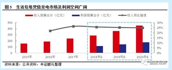根據(jù)垃圾處理“十三五”規(guī)劃,到2020年底,設(shè)市城市生活垃圾焚燒處理能力占無(wú)害化處理總能力的50%以上,其中東部地區(qū)達(dá)到60%以上。生活垃圾清運(yùn)量上升及垃圾焚燒發(fā)電處理方式占比提升均可為行業(yè)增長(zhǎng)提供支撐。以2016年生活垃圾焚燒無(wú)害化日處理能力25.59萬(wàn)噸/日為基數(shù),按產(chǎn)能利用率80%,垃圾處理單價(jià)50元/噸,噸上網(wǎng)發(fā)電量280度,上網(wǎng)電價(jià)0.65元/度,單位產(chǎn)能投資額46萬(wàn)元/萬(wàn)噸/日,運(yùn)營(yíng)、設(shè)備制造及安裝、PPP工程業(yè)務(wù)利潤(rùn)率分別為40%、35%、30%測(cè)算,中證鵬元預(yù)測(cè)2018-2020年生活垃圾焚燒發(fā)電行業(yè)市場(chǎng)空間分別為289.11億元、361.92億元和451.69億元,增速分別為25.67%、25.18%和24.80%,利潤(rùn)空間分別為113.94億元、142.30億元和177.27億元。