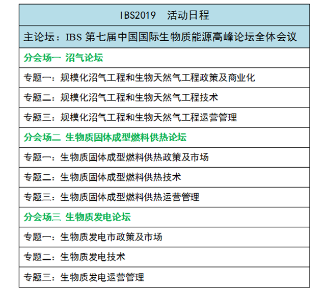 IBS2019將在兩天的會議中,開展生物質(zhì)沼氣論壇、生物質(zhì)發(fā)電、生物質(zhì)固體成型燃料和供熱三大專場。從“沼氣工程和生物天然氣工程政策及商業(yè)化(及沼氣設(shè)備),沼氣工程和生物天然氣工程技術(shù)及工程運(yùn)營管理”到“生物質(zhì)原料收儲運(yùn)技術(shù)與裝備、生物質(zhì)發(fā)電市政策及市場、燃煤生物質(zhì)耦合發(fā)電技術(shù)及發(fā)展、生物質(zhì)直燃發(fā)電技術(shù)及設(shè)備應(yīng)用、生物質(zhì)發(fā)電運(yùn)營管理、生物質(zhì)電廠的電氣及過程自動化控技術(shù)與裝備”再到“生物質(zhì)固體成型燃料供熱政策及市場,生供熱技術(shù)與供熱運(yùn)營管理”,精心設(shè)置議題,搭建學(xué)術(shù)企業(yè)共同交流合作的橋梁。