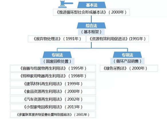 日本自2000年開(kāi)始,推行《推進(jìn)循環(huán)型社會(huì)基本法》,提出了建立循環(huán)型社會(huì)的目標(biāo)。針對(duì)廢棄物處理提出了減量控制(reduce)、回收利用(reuse)和循環(huán)再利用(recycle)的“ 3R”原則。先后頒布實(shí)施了多部法律,包括《推進(jìn)循環(huán)型社會(huì)形成基本法》,以及《廢棄物管理和公共清潔法》、《促進(jìn)資源有效利用法》、《容器和包裝物回收利用法》、《家用電器回收再利用法》、《食品回收再利用法》、《建筑及材料回收法》等專(zhuān)項(xiàng)法規(guī)。