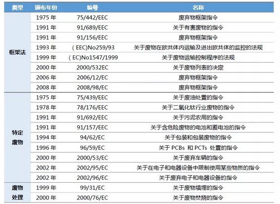歐盟通過(guò)廢棄物框架指令確立了固廢處理的理念,建立了固廢處理體系,其相關(guān)的環(huán)境法律政策實(shí)際由兩部分組成,一部分是各類(lèi)指令,從法律上直接對(duì)各成員國(guó)起約束作用,另一部分是定期頒布的環(huán)境行動(dòng)規(guī)劃,對(duì)各成員國(guó)進(jìn)行目標(biāo)、內(nèi)容上的指導(dǎo)。