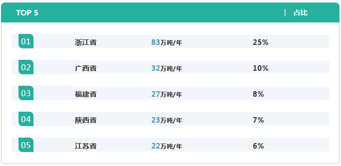 截至2019年4月30日我國已有20個(gè)省份(或直轄市)存在水泥窯協(xié)同處置危險(xiǎn)廢物的產(chǎn)能,規(guī)模前五名的省份為浙江、廣西、福建、陜西和江蘇,合計(jì)規(guī)模占全國總量56%。