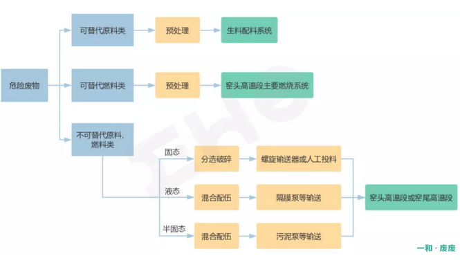 危廢進(jìn)入水泥窯之前需進(jìn)行預(yù)處理,一般根據(jù)危廢性質(zhì)進(jìn)行分類處理: