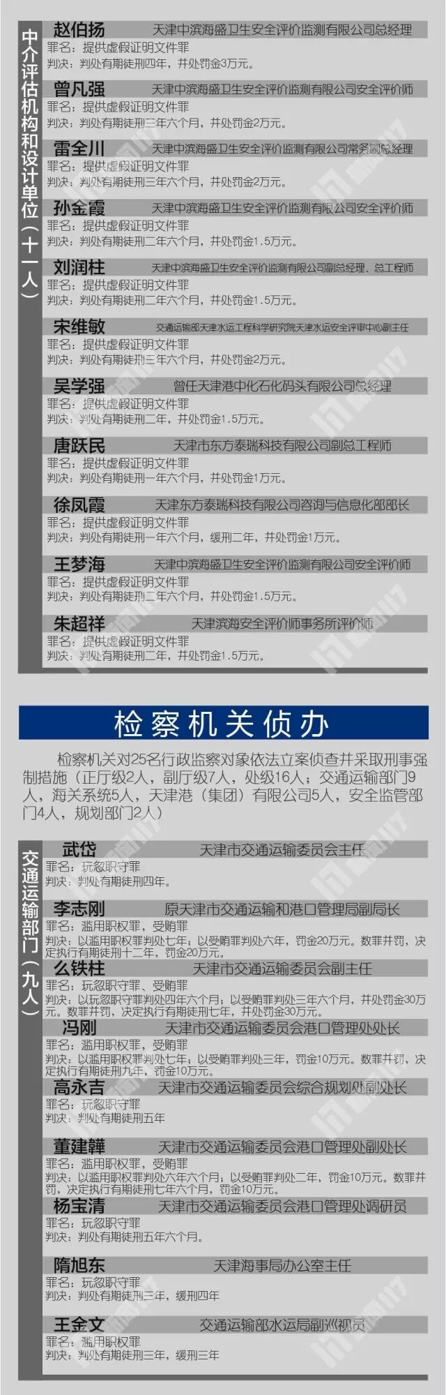 根據(jù)各被告人犯罪的事實(shí)、性質(zhì)、情節(jié)和造成的社會危害后果以及在共同犯罪中的地位、作用,法院依法作出一審判決。瑞海公司董事長于學(xué)偉構(gòu)成非法儲存危險物質(zhì)罪、非法經(jīng)營罪、危險物品肇事罪、行賄罪,予以數(shù)罪并罰,依法判處死刑緩期二年執(zhí)行,并處罰金人民幣70萬元;瑞海公司副董事長董社軒、總經(jīng)理只峰等5人構(gòu)成非法儲存危險物質(zhì)罪、非法經(jīng)營罪、危險物品肇事罪,分別被判處無期徒刑到十五年有期徒刑不等的刑罰;瑞海公司其他7名直接責(zé)任人員分別被判處十年到三年有期徒刑不等的刑罰。中濱安評公司犯提供虛假證明文件罪,依法判處罰金25萬元:中濱安評公司董事長、總經(jīng)理趙伯揚(yáng)等11名直接責(zé)任人員分別被判處四年到一年六個月不等的有期徒刑。天津市交通運(yùn)輸委員會主任武岱等25名國家機(jī)關(guān)工作人員分別被以玩忽職守罪或?yàn)E用職權(quán)罪判處三年到七年不等的有期徒刑,其中李志剛等8人同時犯受賄罪,予以數(shù)罪并罰。