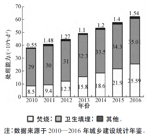 隨著人口的增加和經(jīng)濟(jì)水平的提高,我國生活垃圾產(chǎn)量逐年增加,相應(yīng)地,生活垃圾處理能力也不斷增加。2016年,我國生活垃圾處理設(shè)施共計940座,處理能力62.14萬t/d;城市生活垃圾清運量達(dá)到2.04億t,無害化處理率為96.62%,縣城生活垃圾無害化處理率為85.22%。對我國生活垃圾處理能力進(jìn)行總結(jié),如圖1所示。