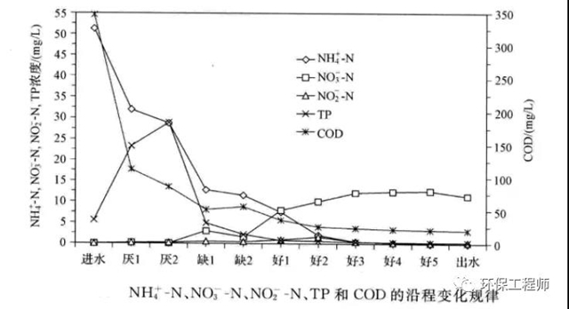 本文通過一張AAO系統(tǒng)內(nèi)污染物的變化曲線針對(duì)每個(gè)段的的水質(zhì)情況進(jìn)行數(shù)據(jù)進(jìn)行分析,了解完這個(gè)就可以快速知道自己系統(tǒng)的問題,其中,各個(gè)單元均是取樣沉淀后,測(cè)定的上清液濃度。
