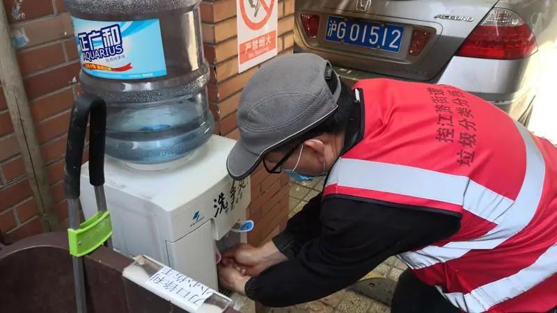 鳳六新苑垃圾投放點(diǎn)旁沒(méi)有條件裝洗手臺(tái)盆,小區(qū)物業(yè)經(jīng)理劉昌澄看了一眼閑置的飲水機(jī),“就你了!”居民破袋時(shí)如果臟了手,就翻起垃圾桶旁飲水機(jī)上的把手,涓涓細(xì)流很快沖走了他們的煩惱。