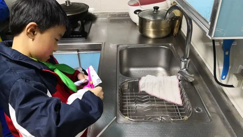 小磊已經(jīng)熟練掌握酸奶盒的分類步驟:剪開(kāi)酸奶盒,倒掉剩余的酸奶;用水沖洗酸奶盒,晾干;把吸管扔進(jìn)干垃圾桶,洗凈晾干的酸奶盒扔進(jìn)可回收物桶