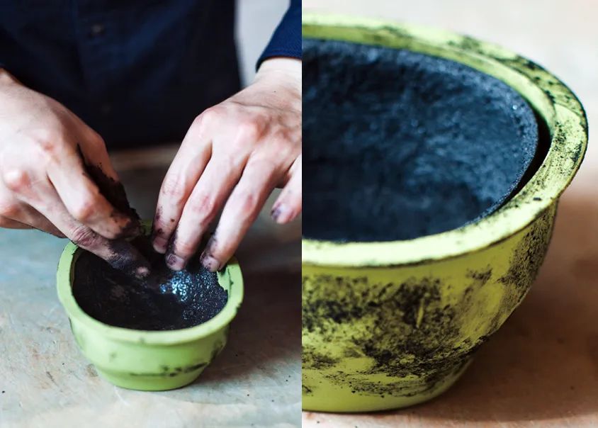 他摸索出了一套處理剩食的獨特手法:把剩菜燒成木炭,把骨頭、筋腱煮成黏膠,融合之后即可塑形,變成一套嶄新的“純天然”器皿。