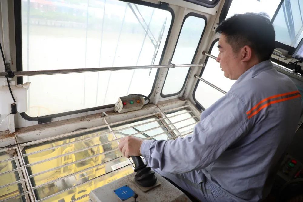 碼頭上,橋吊司機(jī)衛(wèi)益民正在聚精會神地操作吊裝工作,將集裝箱吊回船上