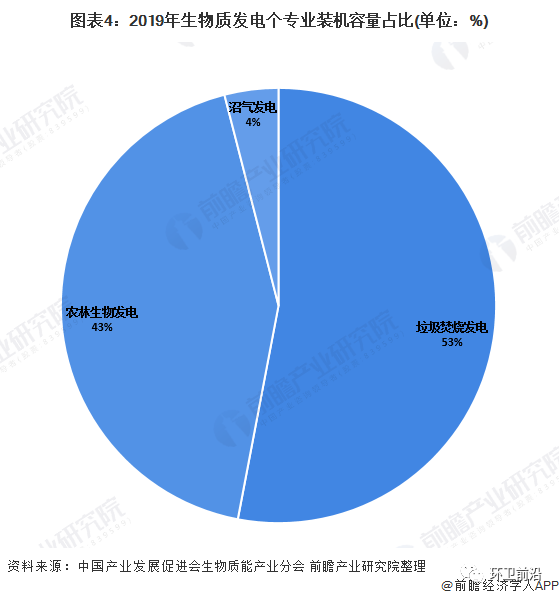 截至2019年底在各類生物質(zhì)能中,垃圾焚燒發(fā)電裝機(jī)容量占生物質(zhì)發(fā)電裝機(jī)總?cè)萘康?3%,排名第一;農(nóng)林生物發(fā)電裝機(jī)容量占比為43%;沼氣發(fā)電裝機(jī)容量占比為4%。