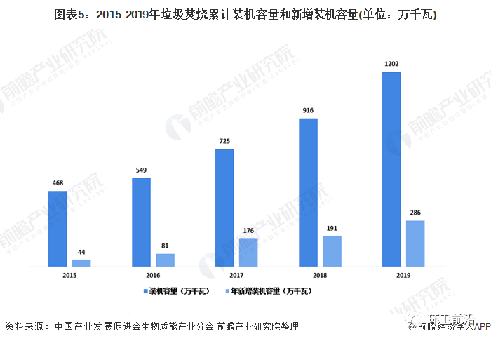 截至2019年底,全國(guó)30個(gè)省(區(qū)、市)垃圾焚燒發(fā)電累計(jì)裝機(jī)容量為1202萬千瓦,較2018年增長(zhǎng)31%,2019年新增發(fā)電裝機(jī)容量286萬千瓦。