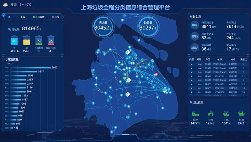 該平臺自2018年底建成投用,用真實數據實時繪制申城垃圾物流走向圖,實現(xiàn)數字化、可視化監(jiān)控,賦予生活垃圾“數字生命”。具體來說,垃圾產生的時間,從哪個轄區(qū)來的,哪輛車清運的,裝進了哪個集裝箱,運到哪里處置,全部一清二楚。目前,該平臺已接入全市16個區(qū)的生活垃圾數據,大大提升了分類實效。在智能化監(jiān)管之前,干濕垃圾比例是在9比1,現(xiàn)在已經“逆襲”到6比4左右,這恰恰說明更多濕垃圾從干垃圾里分出來了,分類精度大幅躍升。