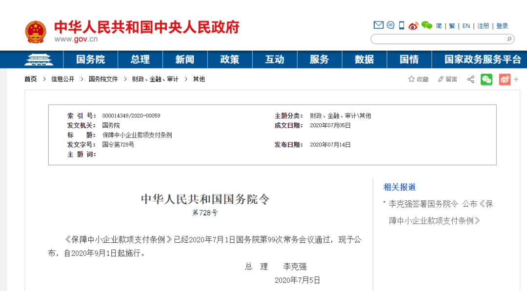 《保障中小企業(yè)款項(xiàng)支付條例》已經(jīng)2020年7月1日國(guó)務(wù)院第99次常務(wù)會(huì)議通過(guò),現(xiàn)予公布,自2020年9月1日起施行。