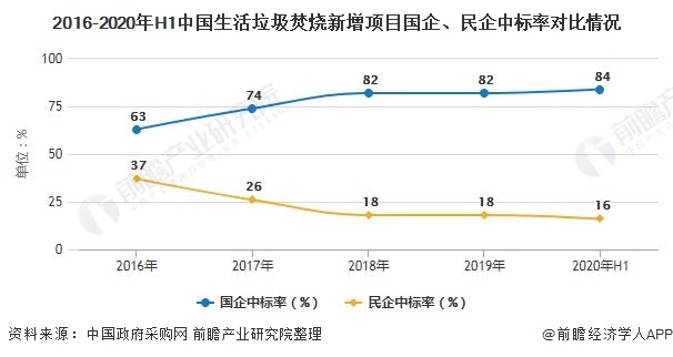 數(shù)據(jù)顯示,2016-2020年,垃圾焚燒項(xiàng)目的中標(biāo)企業(yè)逐步向國(guó)企傾斜。2016年,全國(guó)垃圾焚燒項(xiàng)目的國(guó)企中標(biāo)率為63%;至2020年上半年,國(guó)企中標(biāo)率提升至84%。