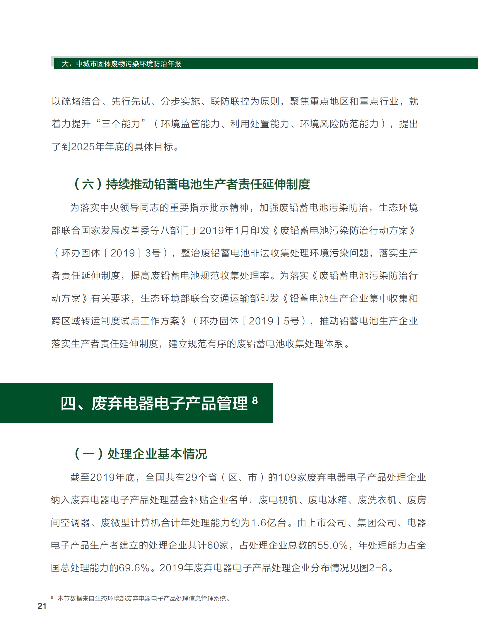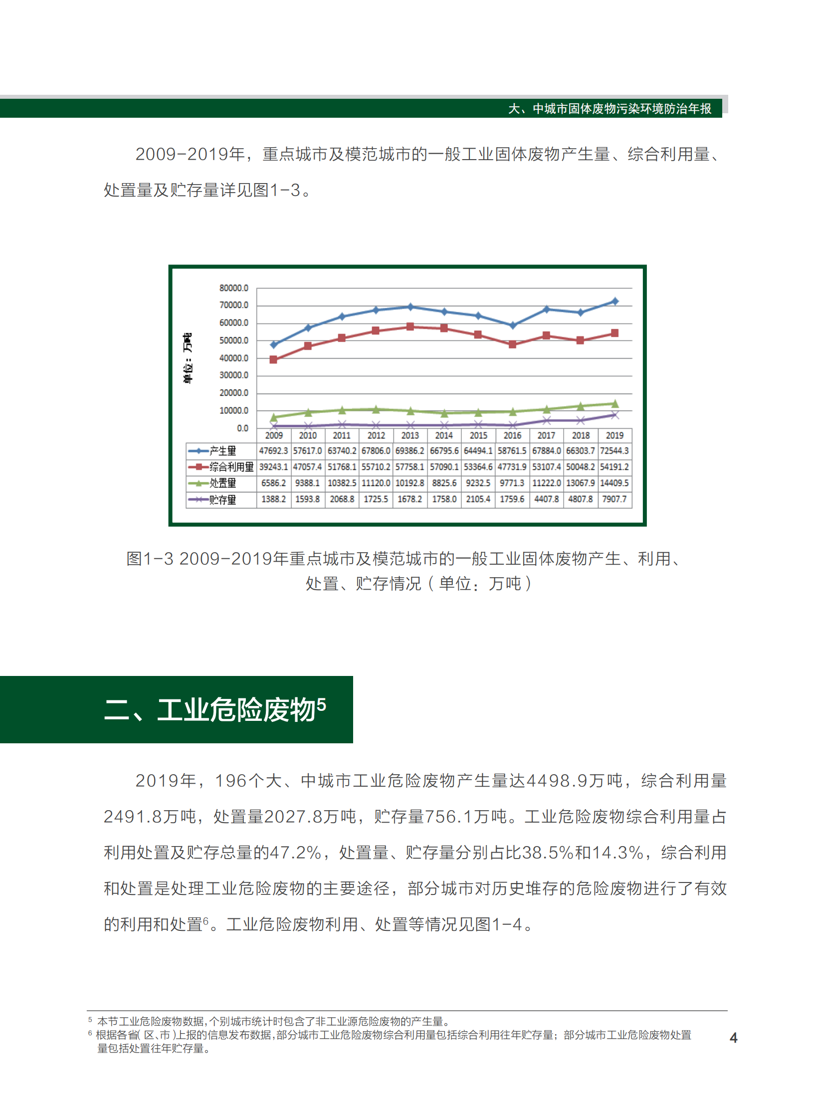 《2020年全國大、中城市固體廢物污 染環(huán)境防治年報》從大、中城市信息發(fā)布、重點工作進展以及地方工作實踐等方面, 系統(tǒng)介紹了2019年我國固體廢物污染環(huán)境防治工作的相關情況。