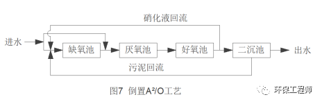 與常規(guī)的A2/O工藝相比,倒置A2/O工藝(見圖7)從前往后以此為缺氧-厭氧-好氧,該工藝的設(shè)計初衷是為了降低污泥回流中硝態(tài)氮對厭氧釋磷的影響,特別是對于高氨氮廢水污泥回流中攜帶有大量的硝氮,抑制厭氧釋磷反應(yīng)。同時,為了解決碳源分配的問題,采用兩點進水的方式來提供厭氧釋磷中有機物的消耗。