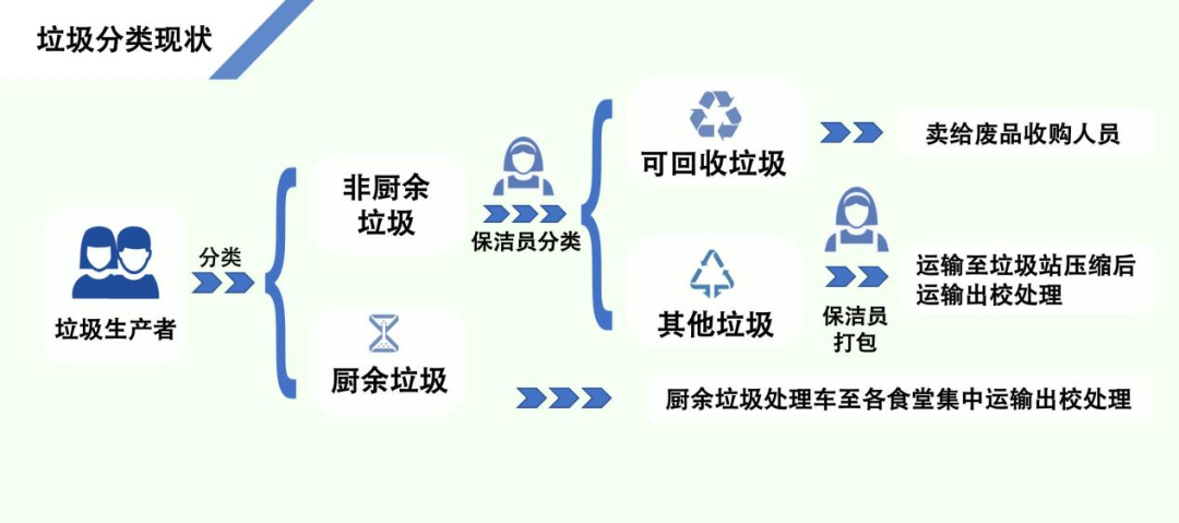 物業(yè)公司的張美婷分管一組團的宿舍樓棟工作,她在之前的巡視中觀察到很多垃圾未經分類就扔在了桶里。她表示,宿舍樓棟垃圾在保潔員下班后確實存在堆積情況,但在工作時間內能夠保證垃圾的清運,如果同學們丟棄的垃圾沒有分好類便會增加保潔員負擔。