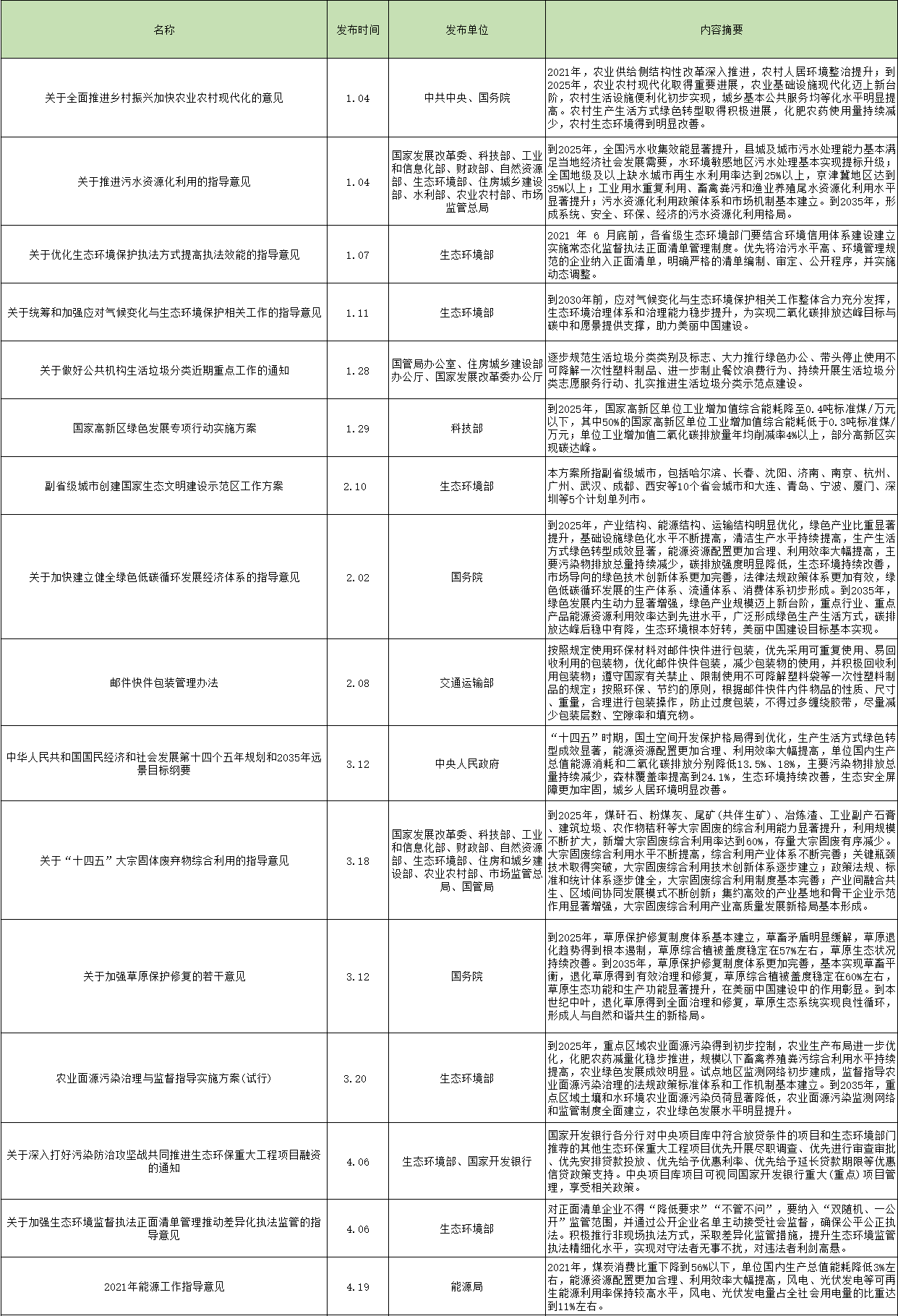 《關(guān)于統(tǒng)籌和加強應(yīng)對氣候變化與生態(tài)環(huán)境保護相關(guān)工作的指導(dǎo)意見》明確指出,要為實現(xiàn)二氧化碳排放達峰目標與碳中和愿景提供支撐;《關(guān)于加快建立健全綠色低碳循環(huán)發(fā)展經(jīng)濟體系的指導(dǎo)意見》要求,到2025年,綠色低碳循環(huán)發(fā)展的生產(chǎn)體系、流通體系、消費體系初步形成。