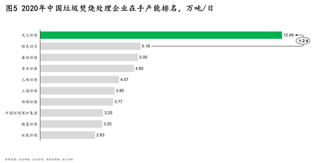 當(dāng)前,我國(guó)垃圾焚燒處理市場(chǎng)呈現(xiàn)“一枝獨(dú)秀”的競(jìng)爭(zhēng)格局:處于領(lǐng)先地位的光大環(huán)境,連續(xù)多年排名第一,截至2020年底,在手產(chǎn)能[2]12.49萬(wàn)噸/日,是排在第二位的綠色動(dòng)力5.18萬(wàn)噸/日的2.4倍,優(yōu)勢(shì)十分明顯,而排在第2-9位的企業(yè),在手產(chǎn)能大多在3-5萬(wàn)噸/日左右,實(shí)力相當(dāng),差距不大(見(jiàn)圖5)。