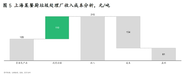 由于沼氣、粗油脂等資源化產(chǎn)物產(chǎn)量少、應(yīng)用有限,在當(dāng)前技術(shù)工藝下,餐廚垃圾處理的資源化價值很難獲得規(guī)模性與經(jīng)濟(jì)性,商業(yè)模式尚未完全走順暢。目前我國政府對餐廚垃圾企業(yè)實行運行補貼和收運補貼,具體金額大小受技術(shù)、地區(qū)、試點發(fā)展過程、項目處理量等因素影響。調(diào)研發(fā)現(xiàn),由于資源化產(chǎn)品盈利有限,難以覆蓋全部成本,餐廚垃圾處理企業(yè)的盈利當(dāng)前主要依靠政府補貼(見圖5)。