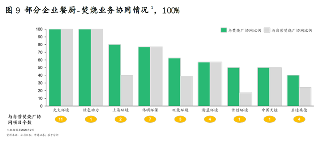 在垃圾分類全面推行的大背景下,這些大型固廢企業(yè)正利用協(xié)同優(yōu)勢降維打擊(見圖9)。一方面,垃圾焚燒主業(yè)帶給這些企業(yè)資金和政府資源雙重優(yōu)勢;另一方面,協(xié)同處置帶來降本增效,可以幫助這些企業(yè)降低財務(wù)壓力:在收入端,協(xié)同優(yōu)勢在于餐廚沼渣余電上網(wǎng);而在成本端,除可節(jié)約土建、人工等成本外,干濕垃圾處置的發(fā)電設(shè)備、除臭系統(tǒng)、滲濾液處理系統(tǒng)、蒸汽供熱系統(tǒng)等也可共用,從而降低折舊攤銷成本。