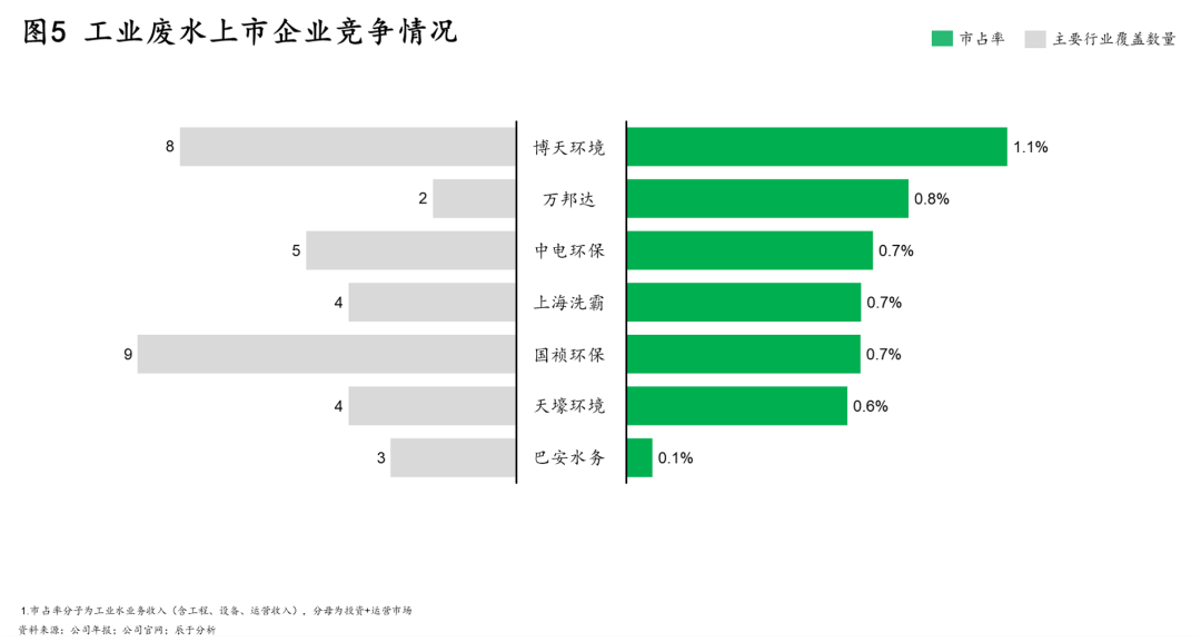 不同行業(yè)廢水的處理方式大不相同,且存在較高的技術(shù)壁壘,工業(yè)廢水治理企業(yè)通常只能專注于某一個或某幾個細(xì)分領(lǐng)域,導(dǎo)致當(dāng)前行業(yè)競爭格局分散,頭部企業(yè)市場占有率偏低,“小而散”是主流狀態(tài)(如圖5)。