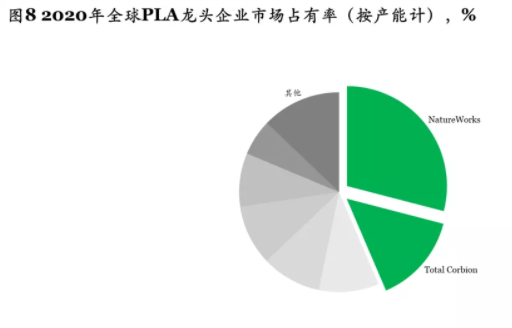 原料價(jià)格高、技術(shù)水平較低、產(chǎn)能利用率較低,是導(dǎo)致我國可降解塑料價(jià)格居高不下的三大主因。以PLA為例,一步法雖然成本低但品質(zhì)差,二步法品質(zhì)優(yōu),是目前主流合成路線,但成本高,是一步法的2.3倍左右。如何實(shí)現(xiàn)高純度、低成本是提升滲透率、贏得市場競爭的關(guān)鍵:例如美國NatureWorks、法國 Total 和荷蘭 Corbion 的合建公司Total Corbion由于擁有PLA制備中間體—丙交酯的低成本高純度制備工藝而指引全球市場,2020年的產(chǎn)能占有率分別達(dá)到29.04%和14.52%(圖8)。
