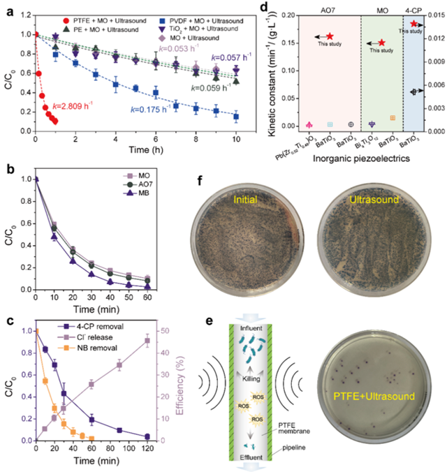 PTFE壓電催化產(chǎn)生ROS的潛在應(yīng)用:ROS在環(huán)境、化學(xué)以及生物醫(yī)藥領(lǐng)域具有廣泛應(yīng)用。例如,PTFE在超聲作用下能分解甲基橙、酸性橙7、亞甲基藍(lán)、四氯酚以及硝基苯等多種污染物。與傳統(tǒng)有機(jī)和無機(jī)壓電材料對(duì)比發(fā)現(xiàn),PTFE分解甲基橙的準(zhǔn)一級(jí)速率常數(shù)是經(jīng)典的有機(jī)壓電材料PVDF的16倍以上,也遠(yuǎn)高于目前文獻(xiàn)報(bào)道的無機(jī)壓電材料Pb(Zr0.52Ti0.48)O3,Bi4Ti3O12和BaTiO3。同時(shí)實(shí)驗(yàn)結(jié)果表明,超聲輻射10 min,PTFE膜能顯著抑制細(xì)菌的生長(zhǎng),抑制率可達(dá)99.7%。以上結(jié)果表明,超聲活化的PTFE展現(xiàn)出了優(yōu)異的壓電催化性能,在環(huán)境污染治理中具有廣闊的應(yīng)用前景。