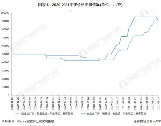 其次,前瞻認(rèn)為這些企業(yè)布局的第二個原因是電池原材料的上漲。以碳酸鋰為例,碳酸鋰作為鋰電池的主要正極材料之一,自2021年年初以來,受到北方地區(qū)天氣及南方地區(qū)限電的影響,碳酸鋰的產(chǎn)量較低,同時新能源汽車和電動自行車下游需求拉動動力電池企業(yè)訂單火爆,造成供不應(yīng)求,電池級碳酸鋰的出廠價從4.3萬元/噸增至9.5萬元/噸。