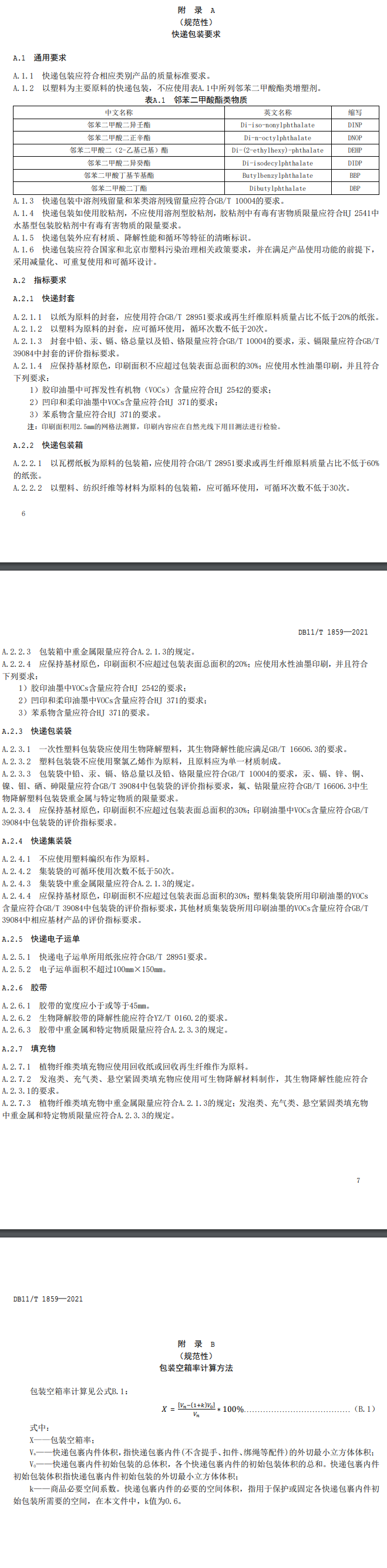 4.1.3 寄遞企業(yè)應(yīng)選擇適宜尺寸的包裝,快遞包裝空箱率不超過20%,包裝空箱率的計(jì)算方法詳見附錄 B。