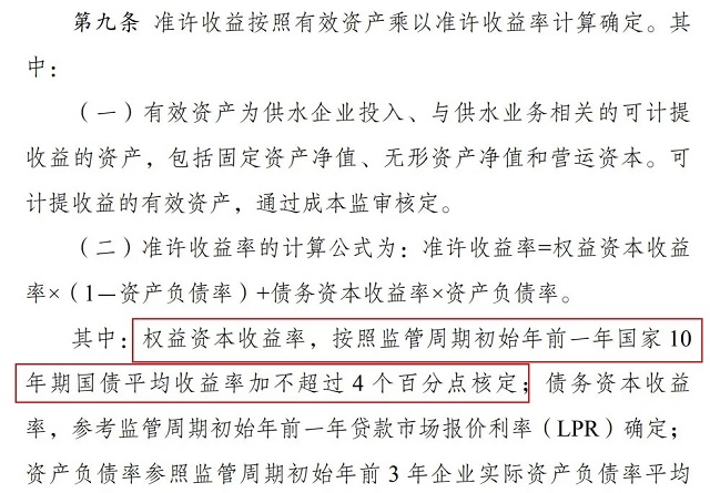 《管理辦法》規(guī)定,供水企業(yè)準(zhǔn)許收益率根據(jù)權(quán)益資本收益率、債務(wù)資本收益率確定,權(quán)益資本收益率按照10年期國債收益率加不超過4個百分點核定,債務(wù)資本收益率按照市場報價利率確定,有利于吸引社會資本進(jìn)入,促進(jìn)供水行業(yè)健康持續(xù)發(fā)展。