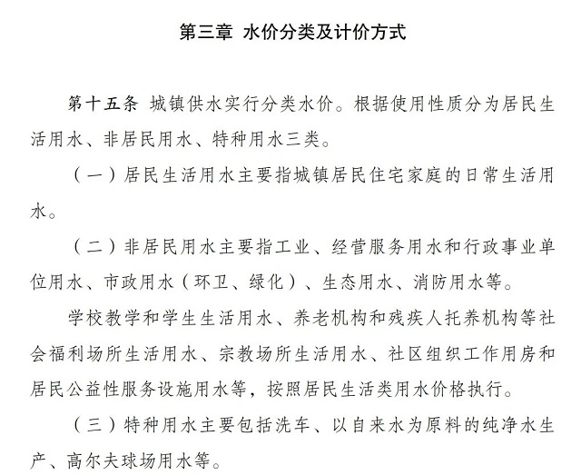 這方面,城鎮(zhèn)供水根據(jù)使用性質(zhì)分為居民生活用水、非居民用水、特種用水三類,居民生活用水實行階梯水價制度、非居民用水實行超定額累進(jìn)加價制度。