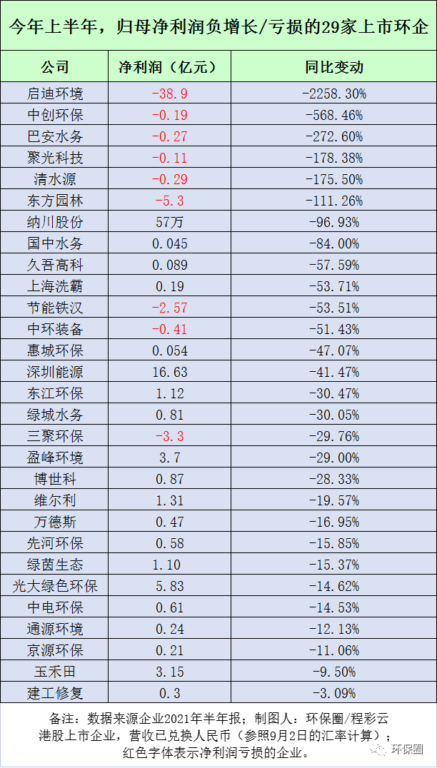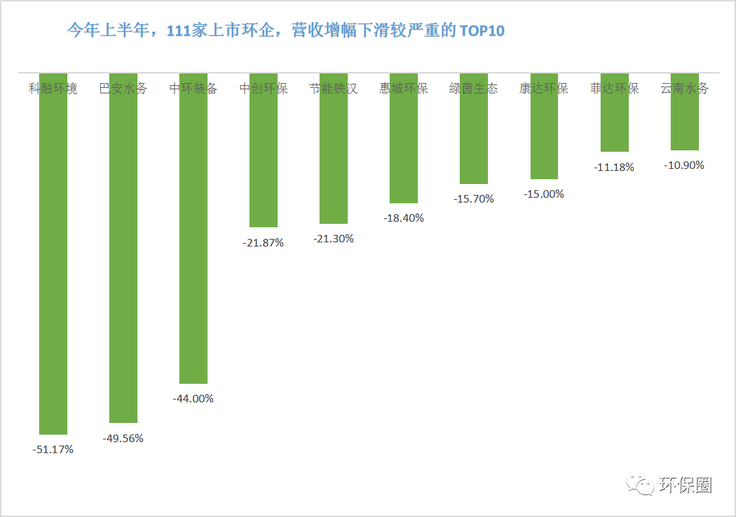 也就是說,今年上半年,111家上市環(huán)企中,無論是營(yíng)業(yè)收入,還是歸母凈利潤(rùn)方面,大家都表現(xiàn)得不錯(cuò),一掃2020年的悲觀情緒,70%以上的環(huán)保企業(yè)都向股東和市場(chǎng)交付了一張靚麗的答卷,實(shí)現(xiàn)了“后疫情時(shí)代”的強(qiáng)勢(shì)反彈。具體到個(gè)股,絕大多數(shù)企業(yè)也都在今年上半年開了個(gè)好頭,經(jīng)營(yíng)業(yè)績(jī)打了個(gè)漂亮“翻身仗”。有的一改往日業(yè)績(jī)頹勢(shì),歸母凈利潤(rùn)實(shí)現(xiàn)百分之幾千增長(zhǎng),如雪浪環(huán)境,城發(fā)環(huán)境、雪迪龍;也有的逐步擺脫虧損帽子,歸母凈利潤(rùn)實(shí)現(xiàn)百分之幾百的大增,如中金環(huán)境、嶺南股份、蒙草生態(tài)、津膜科技、菲達(dá)環(huán)保等;還有的細(xì)分領(lǐng)域龍頭,如上文提到格林美、碧水源、清新環(huán)境,也從去年疫情和產(chǎn)業(yè)寒冬的陣痛中慢慢地企穩(wěn)、好轉(zhuǎn),重現(xiàn)往日輝煌。歷經(jīng)了金融領(lǐng)域去杠桿、PPP政策強(qiáng)監(jiān)管、新冠肺炎疫情沖擊以及民企易主“混改潮”后,這些上市環(huán)企雖然有過迷茫,有過失敗,有過反思,但最終還是重拾信心,不屈不撓,終于迎來了業(yè)績(jī)復(fù)蘇。不過,今年上半年,在業(yè)績(jī)普遍好轉(zhuǎn)的背景下,依然還是有個(gè)別環(huán)保企業(yè)“不爭(zhēng)氣”,表現(xiàn)差強(qiáng)人意,比如啟迪環(huán)境、巴安水務(wù)、節(jié)能國禎、聚光科技、中環(huán)裝備等10家企業(yè)(如圖三所示),營(yíng)收和凈利潤(rùn)雙雙下滑,甚至有的企業(yè)較上年同期,虧損幅度擴(kuò)大化,前景堪憂。圖三:今年上半年,營(yíng)收和凈利潤(rùn)“雙降”的10家上市環(huán)企▼