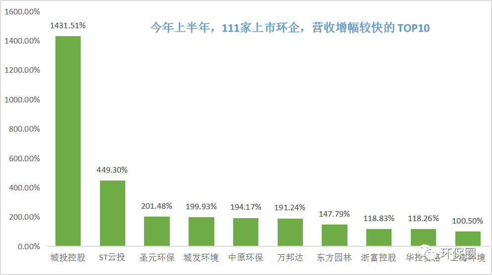 營(yíng)收變動(dòng)幅度方面,數(shù)據(jù)同樣喜人。111家上市環(huán)企,除了那些穩(wěn)步連續(xù)增長(zhǎng)“卓越者”,每年總有一些讓人意想不到的“黑馬”企業(yè)率先突圍出來,少則百分之幾百增長(zhǎng),多則百分之上千增長(zhǎng),成為上半年?duì)I收增速最快的10家先鋒企業(yè)。在半年度營(yíng)收增速TOP10中,既有坐落于上海的房產(chǎn)/水務(wù)/固廢“三劍齊發(fā)”的城投控股以及旗下的上海環(huán)境,也有因納入電價(jià)補(bǔ)貼、部分焚燒項(xiàng)目轉(zhuǎn)運(yùn)營(yíng)推動(dòng)業(yè)績(jī)大增的城發(fā)環(huán)境和圣元環(huán)保,亦有去年業(yè)績(jī)還萎靡不振的萬邦達(dá)和東方園林(如圖六所示)。圖六:半年度營(yíng)收增速較快的TOP10榜單▼