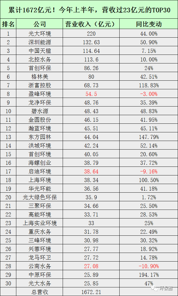 而在半年度營(yíng)收TOP30榜單中,只有啟迪環(huán)境/盈峰環(huán)境/云南水務(wù)略微下降,其余27家均業(yè)績(jī)大喜,30家企業(yè)累計(jì)實(shí)現(xiàn)總營(yíng)收高達(dá)1672億元,這些企業(yè)也掌握著環(huán)保行業(yè)絕大多數(shù)財(cái)富,算是業(yè)內(nèi)較為優(yōu)秀上市企業(yè)(如圖五所示)。圖五:半年度營(yíng)收過23億元的TOP30榜單圖▼