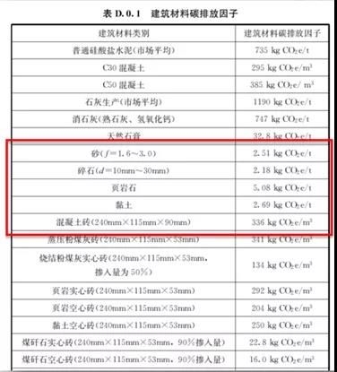 在“雙碳”目標(biāo)下,來(lái)看建筑垃圾處理?!督ㄖ寂欧庞?jì)算標(biāo)準(zhǔn)》(GB/T 52366-2019)6.2.5條中規(guī)定,建材生產(chǎn)時(shí),當(dāng)使用低價(jià)值廢料作為原料時(shí),可忽略其上游過程的碳過程。當(dāng)使用其他再生原料時(shí),應(yīng)按其所替代的初生原料的碳排放的50%計(jì)算;建筑建造和拆除階段產(chǎn)生的可再生建筑廢料,可按其可替代的初生原料的碳排放的50%計(jì)算,并應(yīng)從建筑碳排放中扣除。下表顯示,砂、碎石等骨料的碳排放因子比混凝土磚的碳排放小了2個(gè)數(shù)量級(jí)。