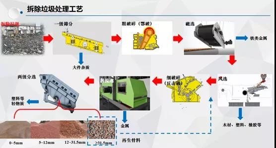 拆除垃圾的處理工藝,確定為“兩級(jí)破碎+兩級(jí)篩分+兩級(jí)風(fēng)選”。先經(jīng)過一級(jí)篩分設(shè)備將大件雜質(zhì)去掉,然后經(jīng)過第一級(jí)粗破碎——鄂破,再用磁選,把鐵類金屬選出來(lái),然后進(jìn)行風(fēng)選,把木材、塑料、橡膠等物質(zhì)篩出來(lái)。之后進(jìn)入二破——反擊破,再通過渦電流分選,把非鐵類金屬選出來(lái),接下來(lái)進(jìn)行兩級(jí)篩分及風(fēng)選,分出再生骨料,可以結(jié)合后端利用途徑,分成不同粒徑集配的骨料。
