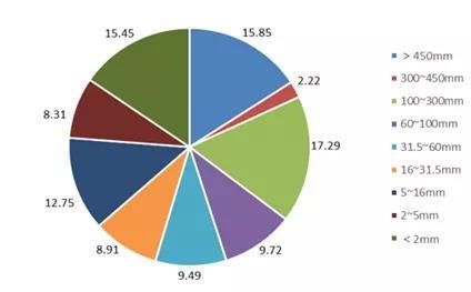 從不同粒徑角度,來(lái)分析拆除垃圾和裝修垃圾,可以看出,兩類垃圾的粒徑范圍比較大。其中粒徑大于450mm的大塊物料以及小于2mm的粉狀物料占比相對(duì)較多,這兩類物料加起來(lái)超過了三分之一。