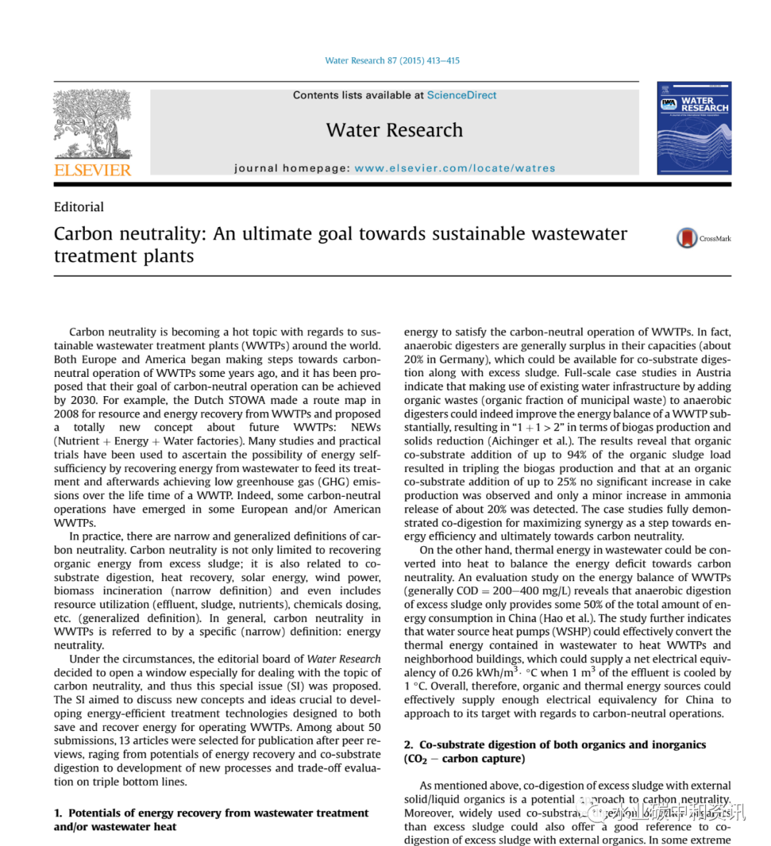 在這種環(huán)境下,《Water Research》編輯委員會(huì)決定開(kāi)辟以專研究碳中和為主題的窗口,特推出本期特刊。本刊旨在為開(kāi)發(fā)高效能源處理技術(shù),探討新理念和觀點(diǎn),旨在污水處理廠運(yùn)行節(jié)能與能源回收。從約50份投稿論文中,經(jīng)同行評(píng)審最后錄用其中13篇文章,內(nèi)容涵蓋了從能源回收與有機(jī)質(zhì)共消化到新工藝與設(shè)計(jì)方法開(kāi)發(fā),再到量化和指導(dǎo)可持續(xù)性工藝發(fā)展等多個(gè)角度。