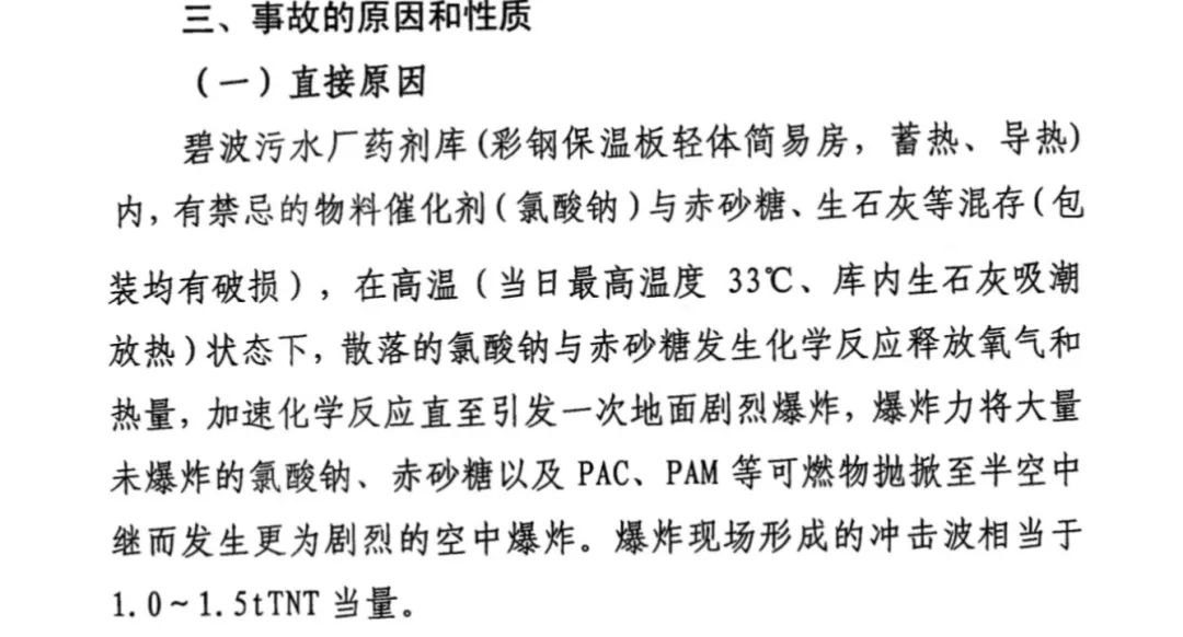 近日,阜新市應急管理局已經(jīng)發(fā)布了《阜新氟產(chǎn)業(yè)開發(fā)區(qū)碧波污水處理廠“7.11”一般爆炸事故調(diào)查報告》(下稱《報告》)。結(jié)果顯示,爆炸的直接原因是該污水廠違規(guī)使用氯酸鈉催化劑,在儲存時與赤砂糖發(fā)生化學反應發(fā)生爆炸,爆炸現(xiàn)場形成的沖擊波相當1.0-1.5tTNT當量。還記得去年7月12日,遼寧省阜新市發(fā)生的污水處理廠爆炸事故嗎?當時網(wǎng)上流傳的視頻顯示,爆炸瞬間的天空都被照亮,附近多個居民家的玻璃被震碎。事故發(fā)生后,國務(wù)委員王勇做出重要批示,遼寧省省長劉寧親赴現(xiàn)場指導并表示,不要帶血的GDP。近日,《環(huán)保圈》注意到,阜新市應急管理局已經(jīng)發(fā)布了《阜新氟產(chǎn)業(yè)開發(fā)區(qū)碧波污水處理廠“7.11”一般爆炸事故調(diào)查報告》(下稱《報告》)。結(jié)果顯示,爆炸的直接原因是該污水廠違規(guī)使用氯酸鈉催化劑,在儲存時與赤砂糖發(fā)生化學反應發(fā)生爆炸,爆炸現(xiàn)場形成的沖擊波相當1.0-1.5tTNT當量。