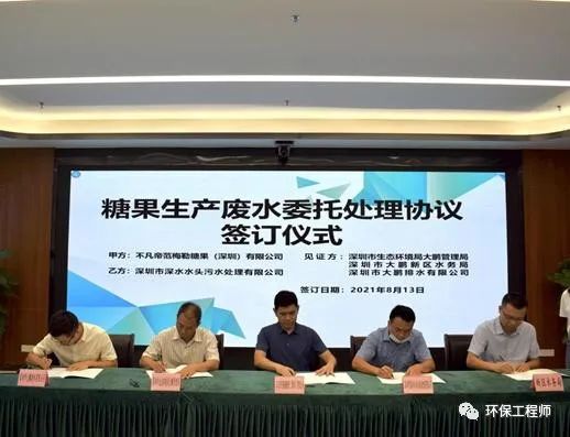 日前深圳市深水水頭污水處理有限公司、不凡帝范梅勒糖果(旗下產(chǎn)品有阿爾卑斯等)深圳有限公司舉行了《糖果生產(chǎn)廢水委托處理協(xié)議》簽約儀式。深圳市生態(tài)環(huán)境局大鵬管理局、大鵬新區(qū)水務(wù)局、大鵬排水有限公司作為見證方共同簽署了《糖果生產(chǎn)廢水委托處理協(xié)議》。