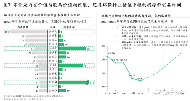 但必須承認的是,向好趨勢的背后,我國資本市場的制度完善仍需時間。首先是生態(tài)環(huán)保企業(yè)內在價值與股票價值的相匹配需要時間,在對生態(tài)環(huán)保企業(yè)2020年營收前15強的營收、ROIC加權和PE倍數(shù)進行分析得到,多數(shù)企業(yè)(如企業(yè)A、E、I、M)的內在價值與股票價值在資本市場上并不匹配。其次是生態(tài)環(huán)保估值中樞的提升仍需時日,盡管隨著國家政策的提振、生態(tài)環(huán)保行業(yè)的發(fā)展、部分細分行業(yè)企業(yè)現(xiàn)金流狀況的改善,環(huán)保估值中樞提升未來可期,但也并不是一蹴而就的(見圖7)。
