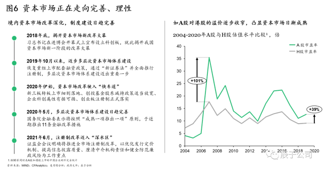 政策推動下,國內資本市場改革逐步深化,制度建設日趨完善,生態(tài)環(huán)保企業(yè)面臨的資本市場大環(huán)境正走向理性。A股對H股的溢價逐步收窄便是其中一佐證:基于對95家同時在A股和港股上市的企業(yè)的分析,可以看到相比于2006年最高峰時A股對H股超過100%的溢價,當前30%-40%的溢價已有明顯收窄(見圖6)。