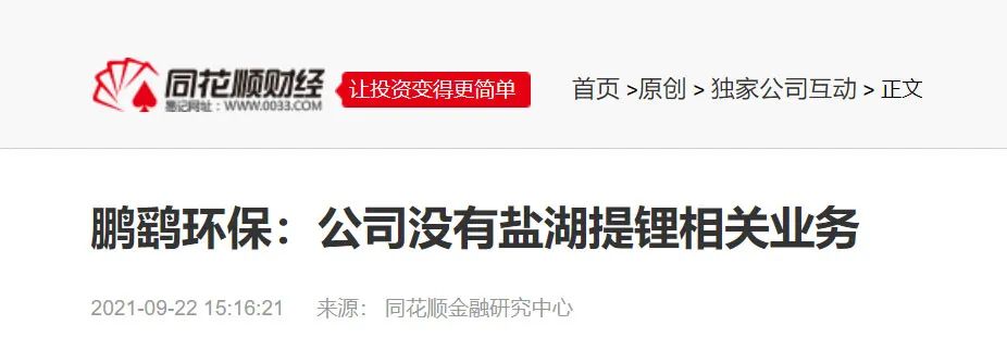 4、鵬鷂環(huán)保:公司沒(méi)有鹽湖提鋰相關(guān)業(yè)務(wù),同花順財(cái)經(jīng),2021-09-22